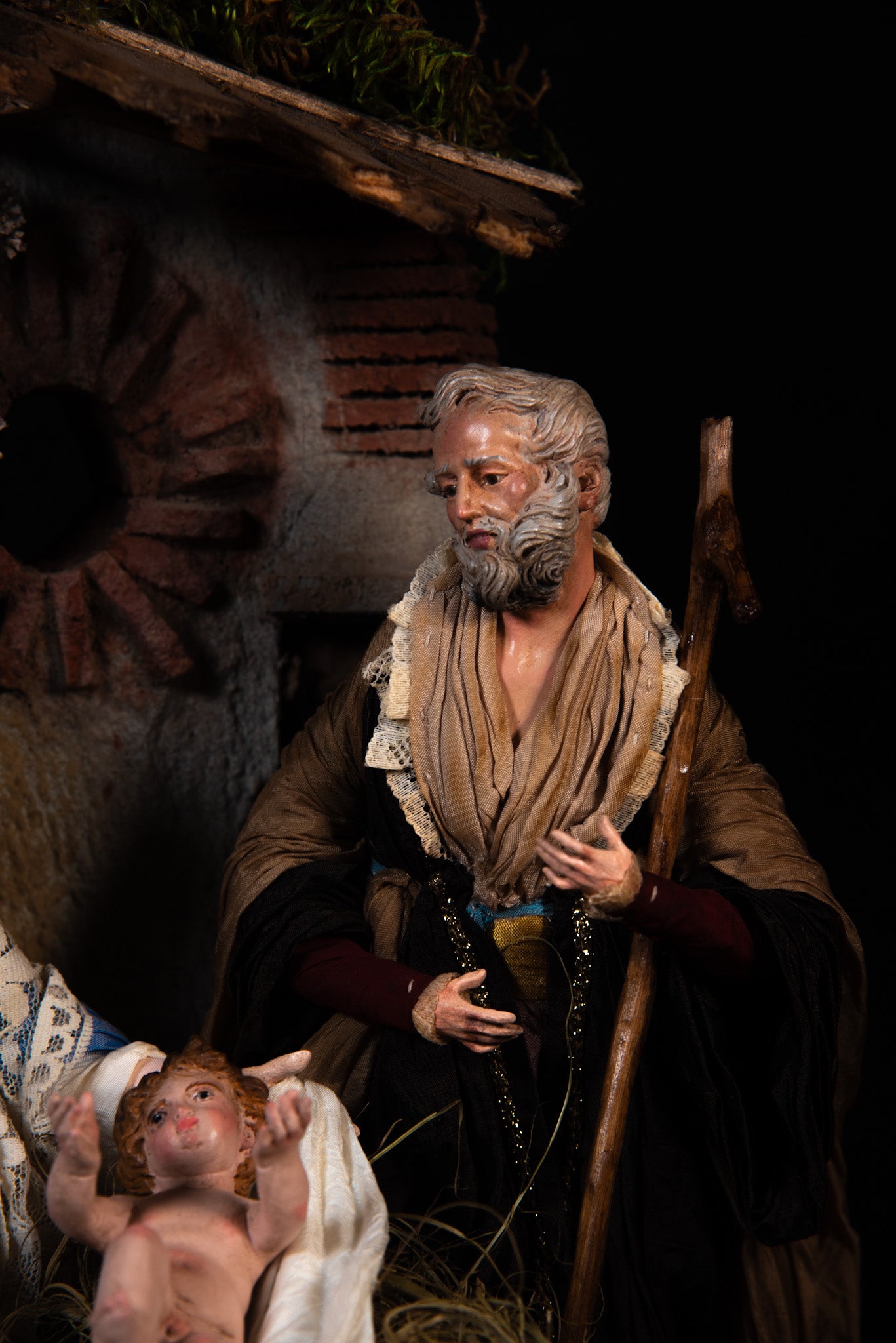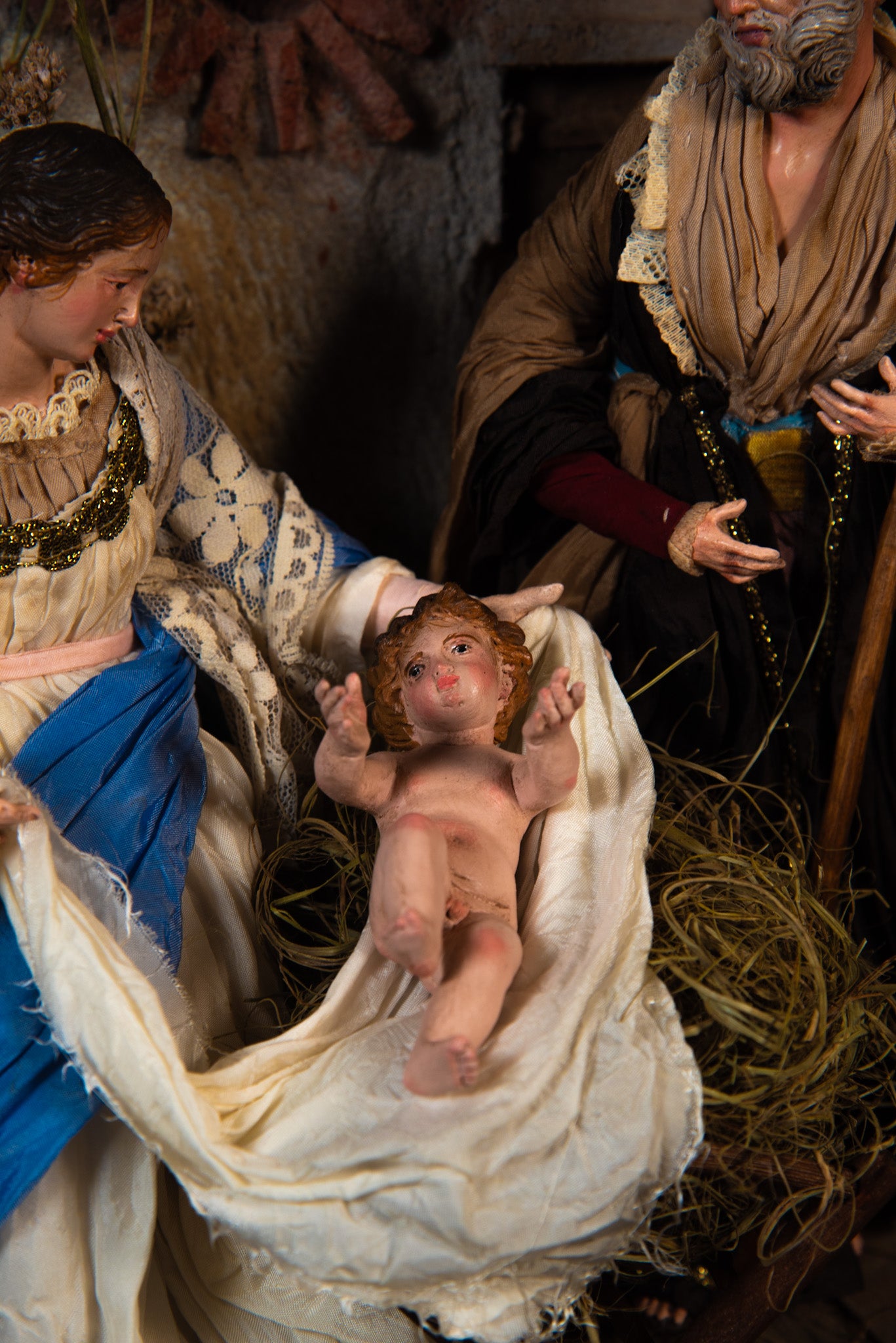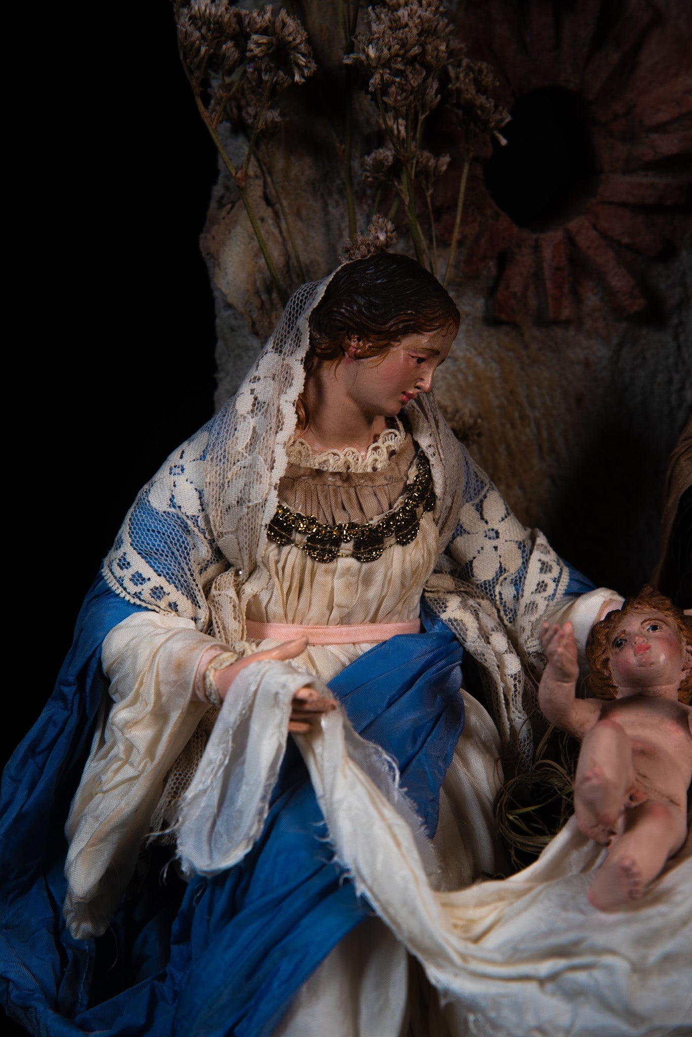 La natività è la scena sacra più importante e rappresentativa della tradizione presepiale napoletana. La scena comprende Madonna e San Giuseppe dotati di mani e piedi in legno, testa in terracotta, occhi di vetro, corpo in fil di stoppa ricoperto da canapa e abiti in seta di San Leucio. Il Bambinello è realizzato interamente in terracotta artigianalmente con occhi di vetro. La base è in legno con doratura in oro foglia e la campana di vetro.